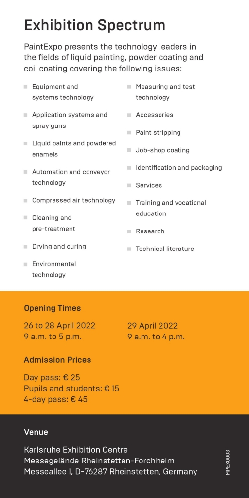 PaintExpo si svolge ogni due anni a Karlsruhe come vetrina per innovazioni, applicazioni, tecnologie future e tendenze che coprono tutti gli aspetti della verniciatura industriale. La fiera copre l’intera gamma di prodotti e servizi internazionali nella catena di fornitura per la tecnologia di rivestimento industriale. L’ampia gamma di prodotti spazia da pistole a spruzzo, attrezzature e materiali fino alla tecnologia di automazione. Questo incontro unico a livello mondiale di aziende del settore non ha eguali in tutto il mondo, il che lo rende estremamente interessante per i fornitori di servizi di rivestimento e le società di rivestimento interne di tutto il mondo.