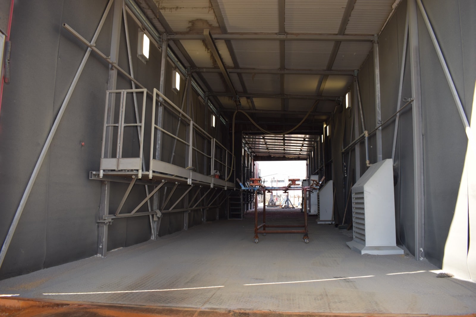 L’azienda MEVI S.r.l. ha progettato una cabina di sabbiatura e verniciatura trasportabile. L’impianto è stato progettato e costruito in maniera tale che risulti smontabile in 5 ore. Inoltre l’impianto è dotata di device utili alla gestione della gru interna in fase di sabbiatura e vernicatura.