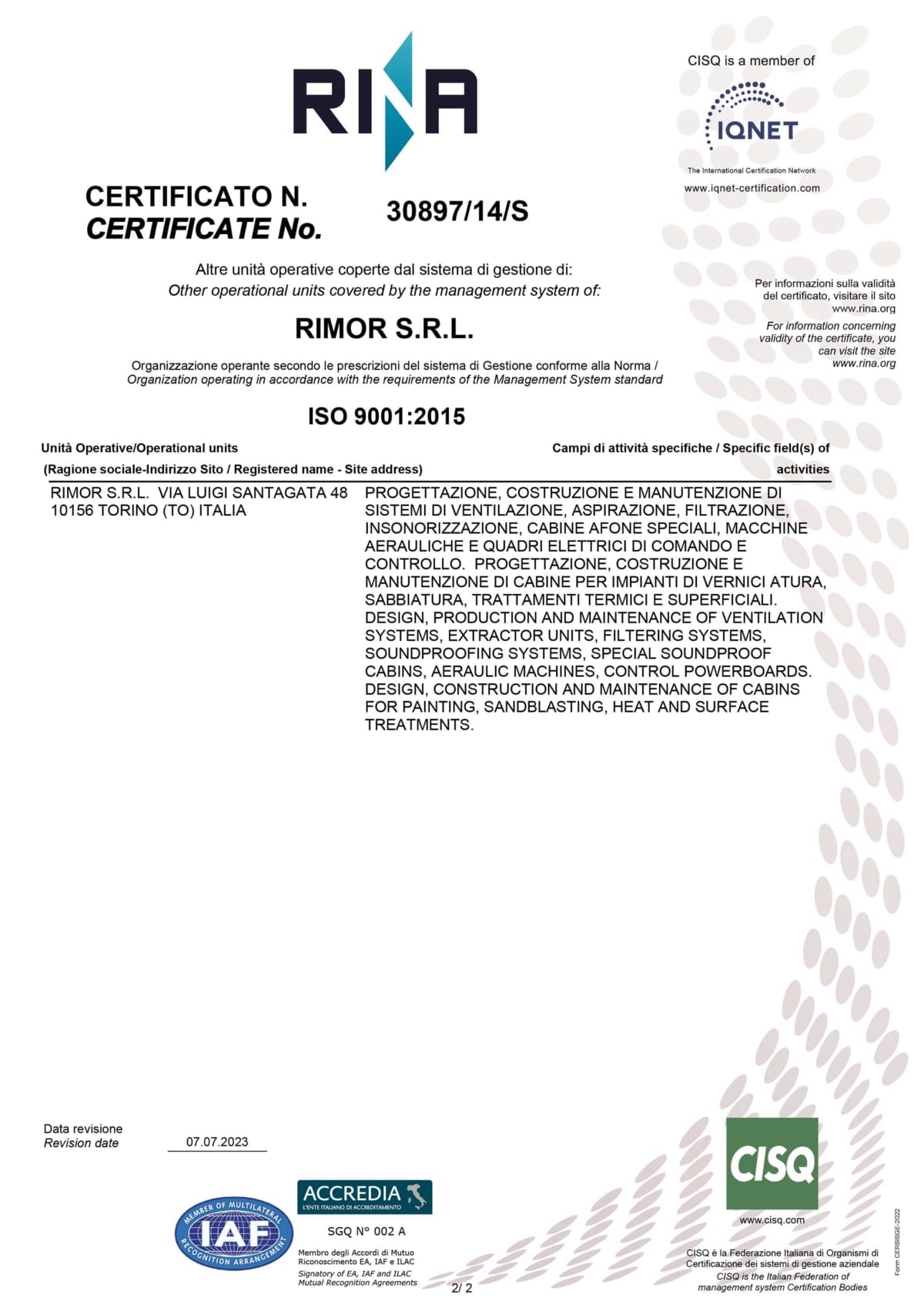 La policy aziendale della Rimor S.r.l., prevede conformità e qualifiche specialistiche e professionali. Dal 2015 infatti, La Rimor S.r.l. è conforme al Sistema standard di Gestione della Qualità ISO 9001:2015 ed IQNet certificato da RINA. Queste certificazioni rappresentano non solo la professionalità dell’azienda ma al contempo, ne certificano la competitività sul mercato.