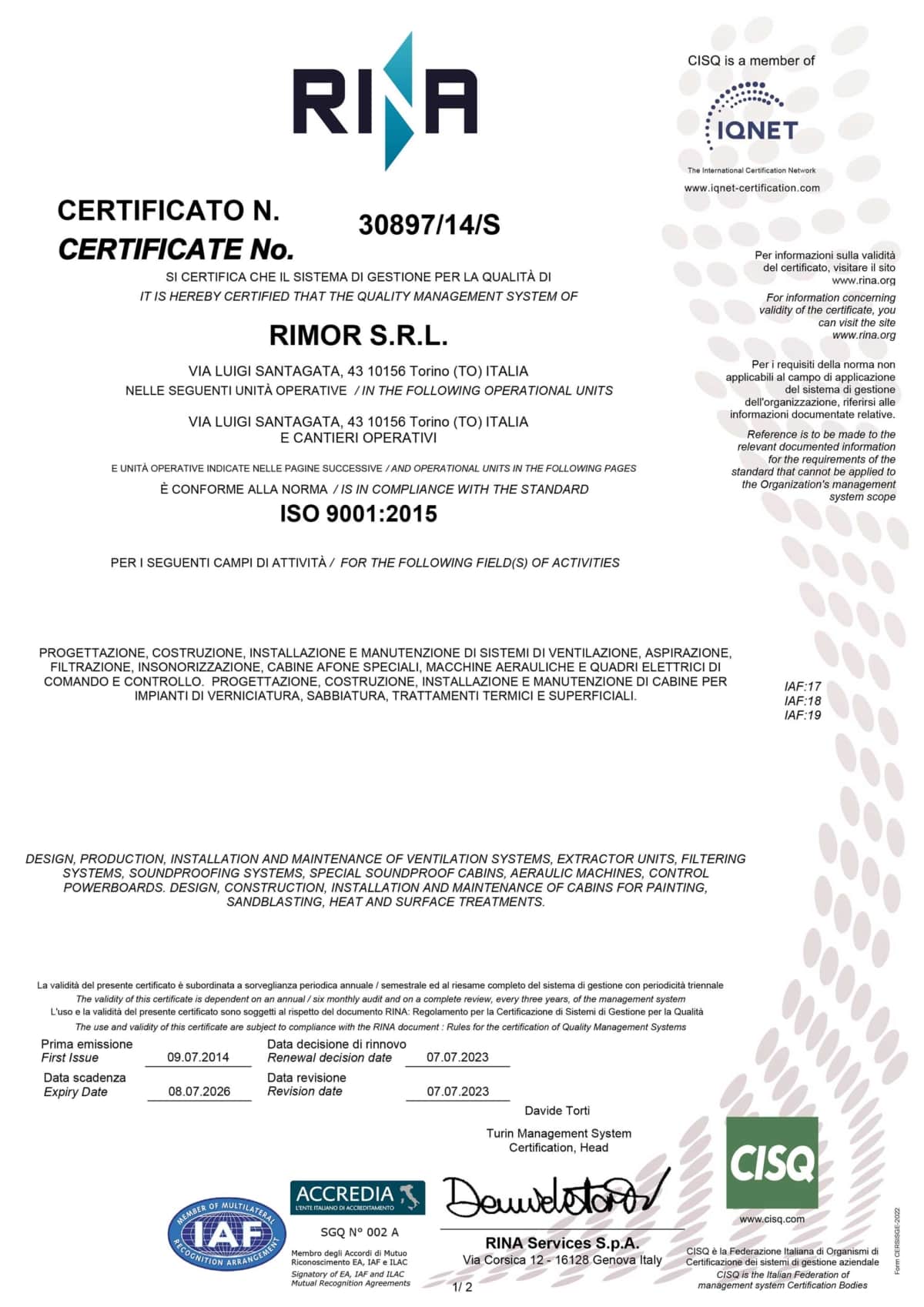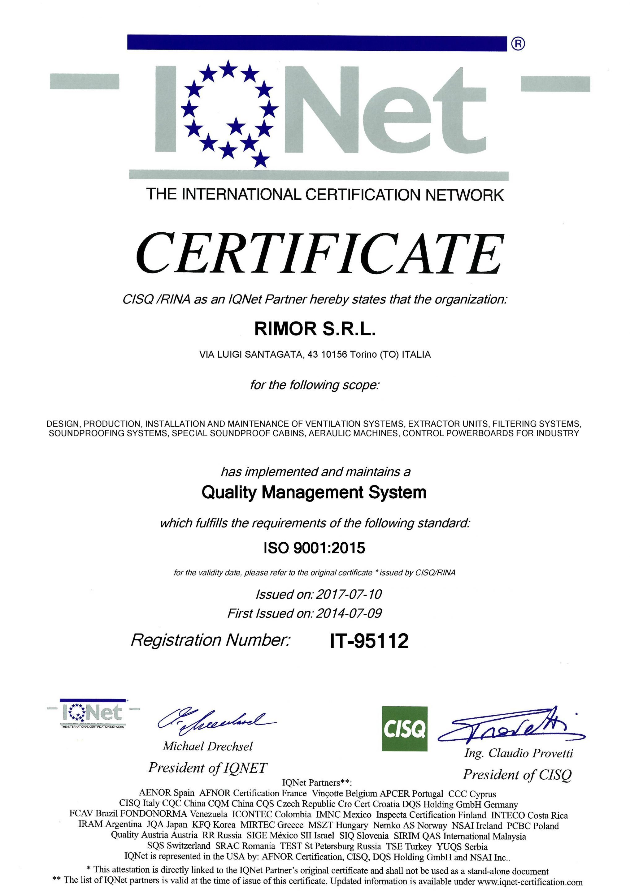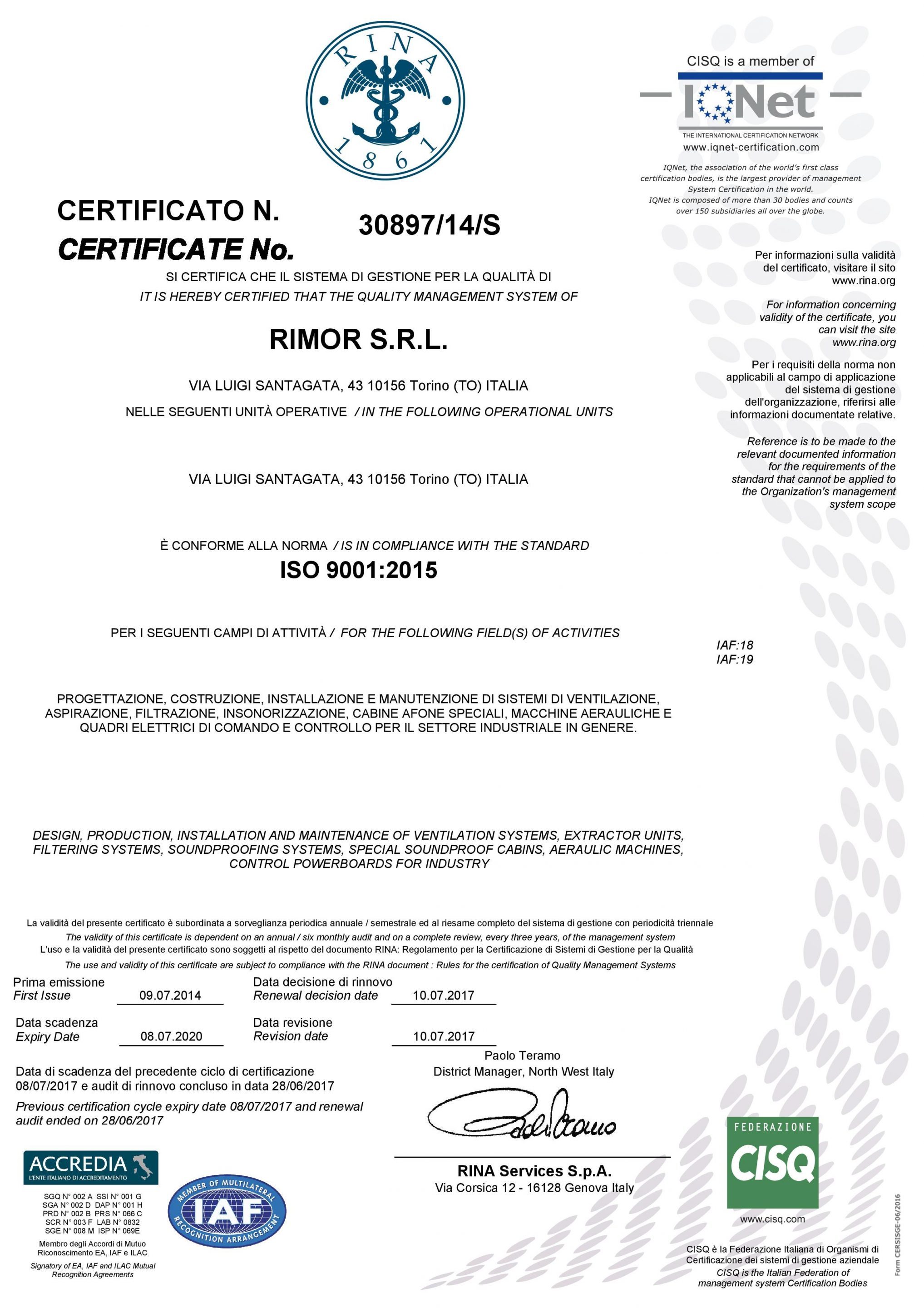 La policy aziendale della Rimor S.r.l., prevede conformità e qualifiche specialistiche e professionali. Dal 2015 infatti, La Rimor S.r.l. è conforme al Sistema standard di Gestione della Qualità ISO 9001:2015 ed IQNet certificato da RINA. Queste certificazioni rappresentano non solo la professionalità dell’azienda ma al contempo, ne certificano la competitività sul mercato.